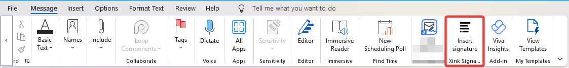 Het is mogelijk om enkele velden aan te passen in je handtekening. Ook kan het zijn dat je meerdere handtekeningen krijgt omdat je bijvoorbeeld voor 2 bedrijven werkt. Als je de handtekening wilt aanpassen open je eerst een nieuwe email. In het menu rechtsboven zoek je de Xink Handtekening / Signature knopje op.