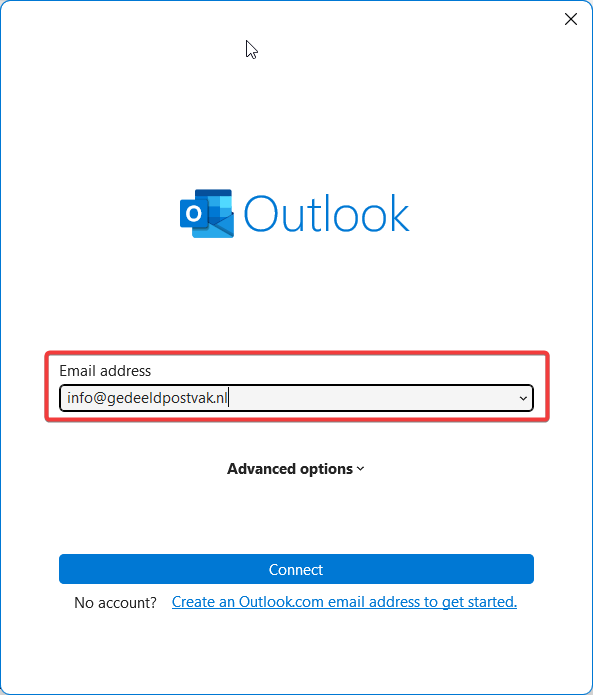 In het volgende scherm voer daar het email adres van het postvak in dat je wilt toevoegen.